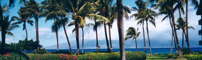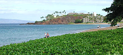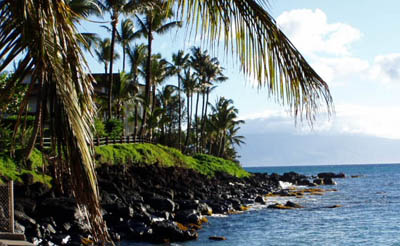 Standing on beach in front of Whaler's Village looking North to Black Rock upon which rests the Sheraton Hotel Resort, South Face.