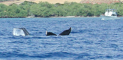 Mother whale teaching her baby how to breath out of water. This mother stood on her head for about five or six minutes as her baby attempted jumps. This photo was taken on the leeward side of Maui, south of Lahaina.
