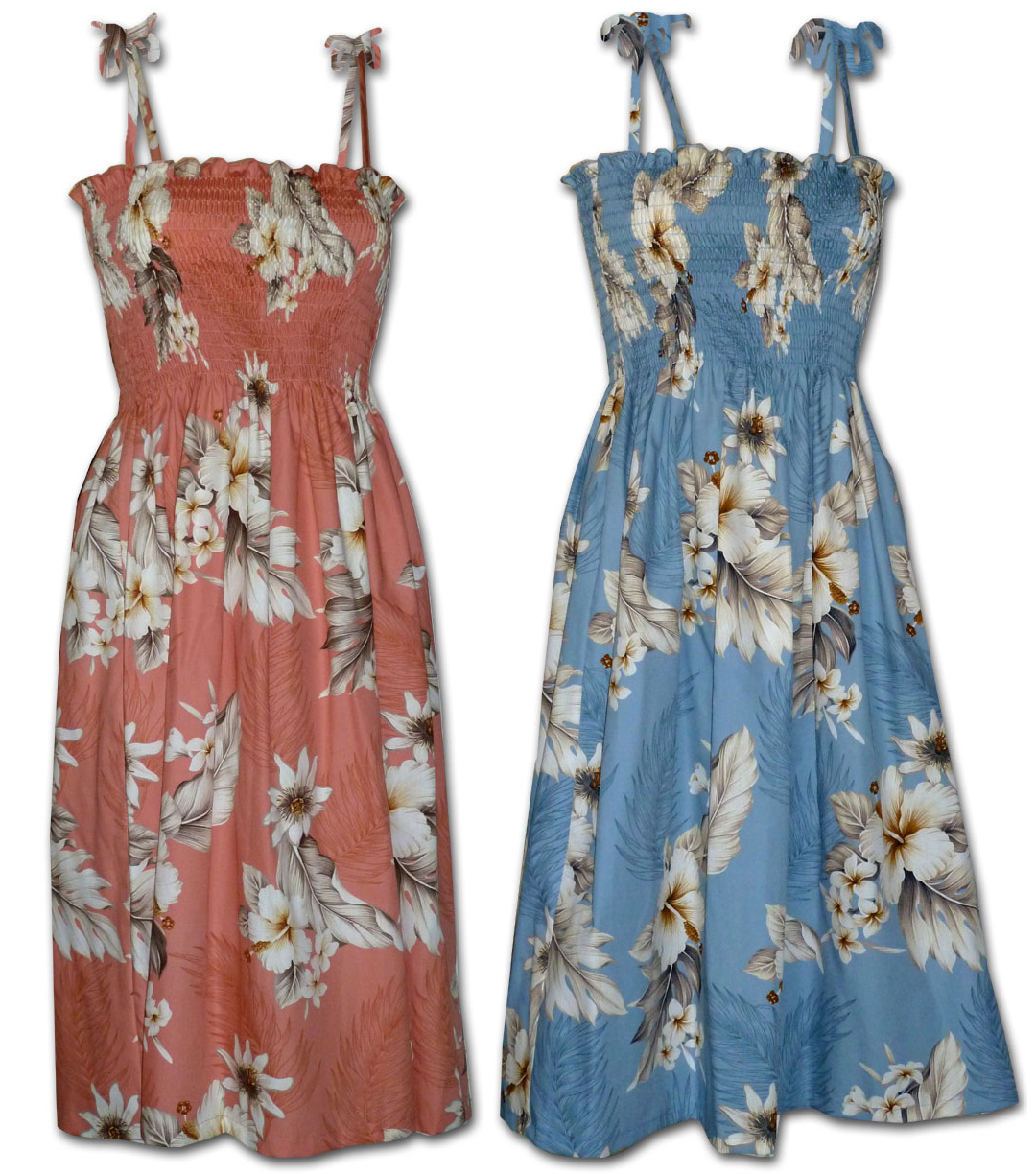 Plumeria Hibiscus Pacific Legend smocked top tube sundress with tie straps is Available in Red, Navy Blue, Peach and Blue.
