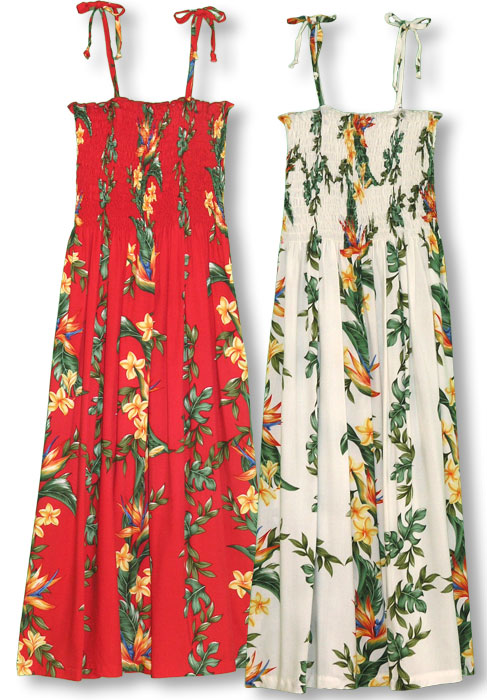 Island Bird of Paradise Panel Ladies tie on spaghetti shoulder straps, wrap-around stretch smocked, tube style, tie halter style - go strapless, sundress is available in Black and White. Red has sold out in all sizes.